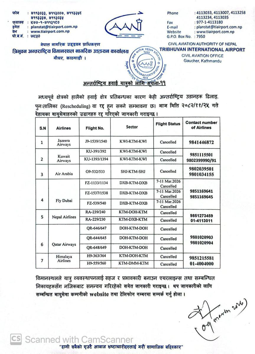 २०८२ फागुन २५, काठमाडौँ । त्रिभुवन अन्तर्राष्ट्रिय विमानस्थल कार्यालयले मध्यपूर्व क्षेत्रको हवाई क्षेत्रमा अमेरिकी तथा इजरायली आक्रमण कारण नेपालबाट हुने नियमित उडान रद्द भएको जनाएको छ ।