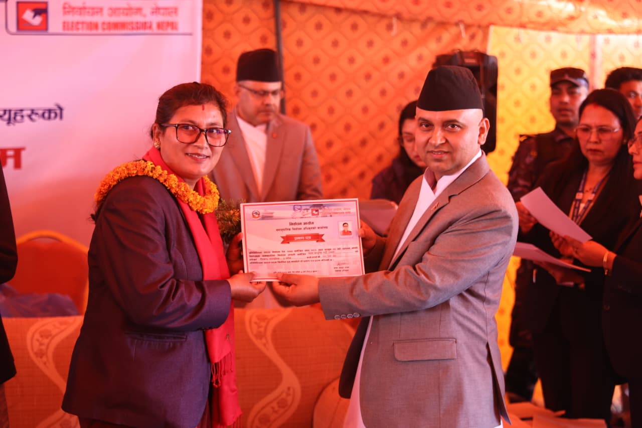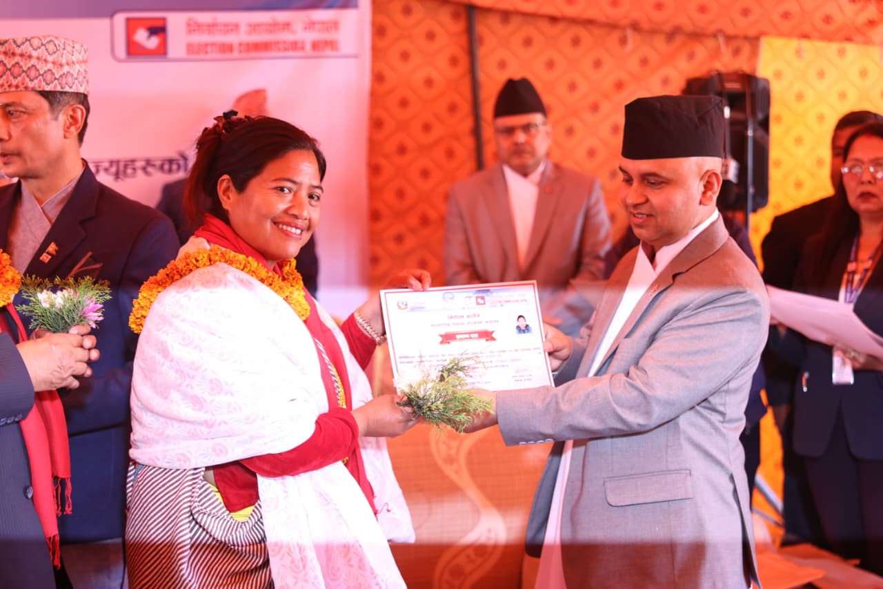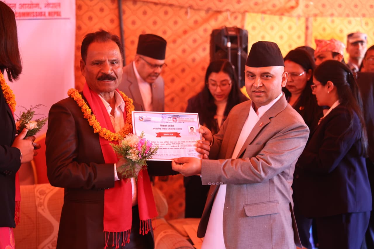 २०८२ चैैैत्र ५, काठमाडौं । निर्वाचन आयोगले समानुपातिकतर्फ निर्वाचित सांसदलाई प्रमाणपत्र प्रदान गरेको छ । बिहीबार आयोगमा आयोजित विशेष समारोहकाबीच आयोगका प्रमुख आयुक्त रामप्रसाद भण्डारीले समानुपातिकतर्फका सांसदहरुलाई प्रमाणपत्र प्रदान गरेका हुन् ।