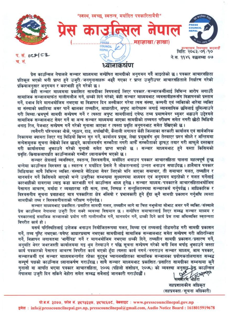काउन्सिलले मिथ्या सूचना, तथ्यहीन सामग्री, तथा सामाजिक सञ्जालमार्फत हुने चरित्र हत्या र धम्कीपूर्ण गतिविधिप्रति कडा कारबाही गरिने चेतावनी दिएको छ ।