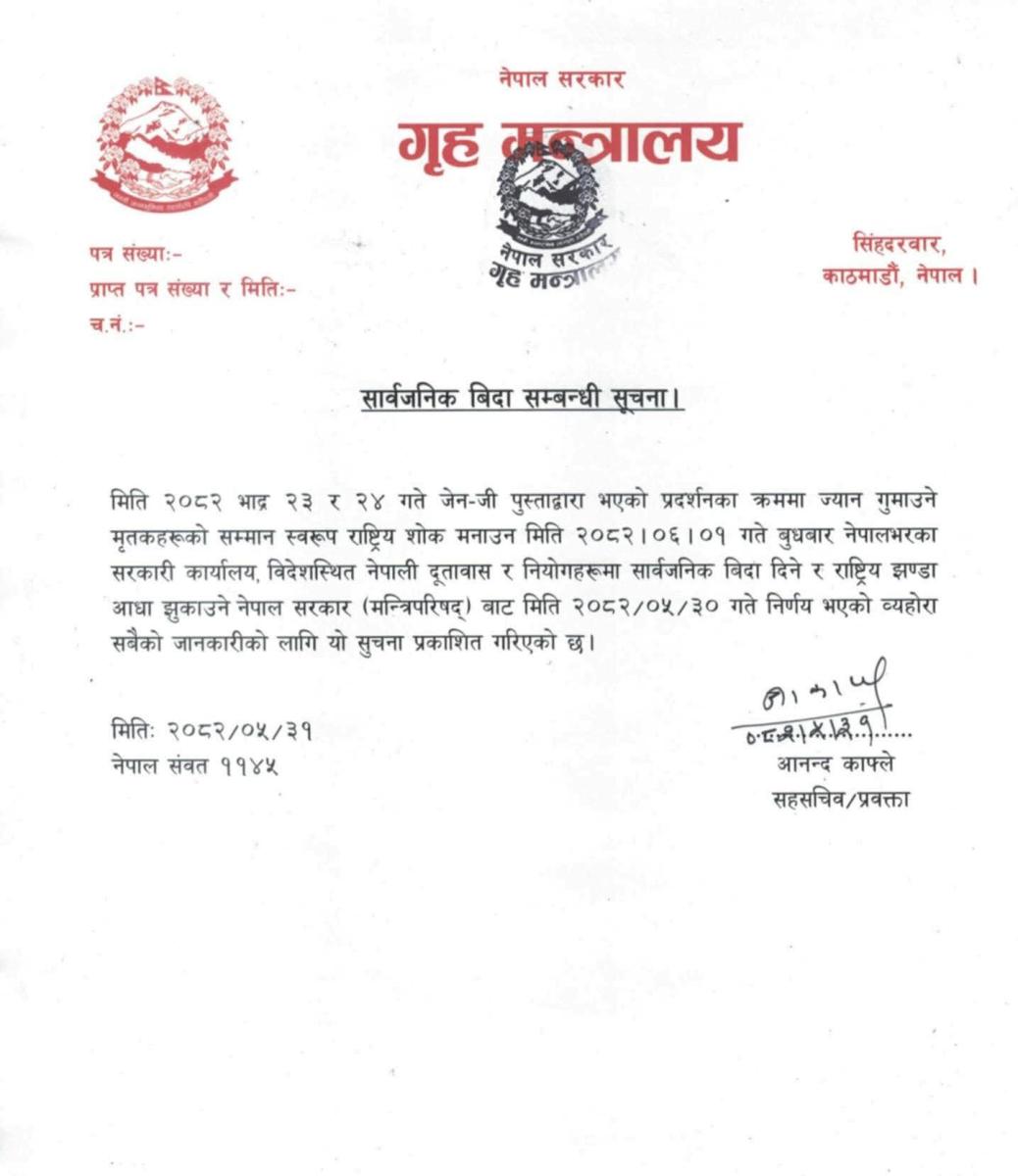 जारी विज्ञप्तिमा भनिएको छ, “भदौ २३ र २४ गते जेनजी पुस्ताद्वारा भएको प्रदर्शनका क्रममा ज्यान गुमाउने मृतकहरूको सम्मानस्वरूप राष्ट्रिय शोक मनाउन असोज १ गते बुधबार नेपालभरका सरकारी कार्यालय, विदेशस्थित नेपाली दूतावास र नियोगहरूमा सार्वजनिक बिदा दिने र राष्ट्रिय झण्डा आधा झुकाउने नेपाल सरकार (मन्त्रिपरिषद्) बाट निर्णय भएको बेहोरा सबैको जानकारीका लागि यो सूचना प्रकाशित गरिएको छ ।”