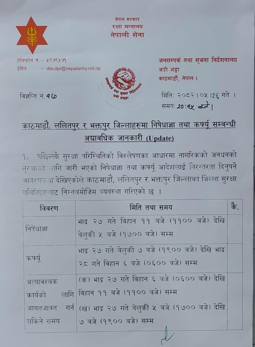 सैनिक जनसम्पर्क तथा सूचना निर्देशनालयका अनुसार निषेधाज्ञा भदौ २७ गतेको बिहान ११ देखि बेलुकी ५ बजेसम्म लागू हुनेछ। कर्फ्यू भने भदौ २७ गते बेलुकी ७ बजेदेखि भदौ २८ गते बिहान ६ बजेसम्मका लागि जारी गरिएको छ ।