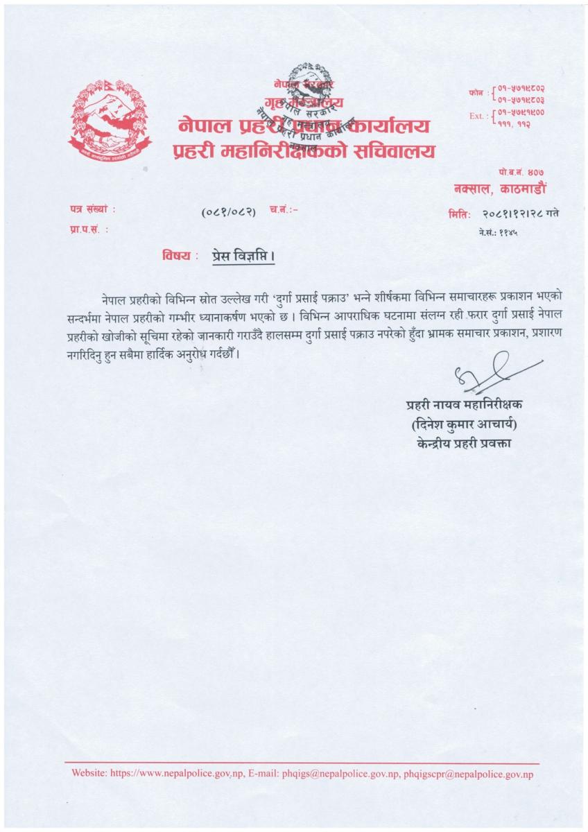 आचार्यले प्रेस विज्ञप्तिमार्फत भनेका छन्, ‘विभिन्न आपराधिक घटनामा संलग्न रही फरार दुर्गा प्रसाईं नेपाल प्रहरीको खोजीको सूचीमा रहेको जानकारी गराउँदै हालसम्म प्रसाईं पक्राउ नपरेको हुँदा भ्रामक समाचार प्रकाशन, प्रसारण नगरिदिनुहुन अनुरोध गर्दछौँ ।’