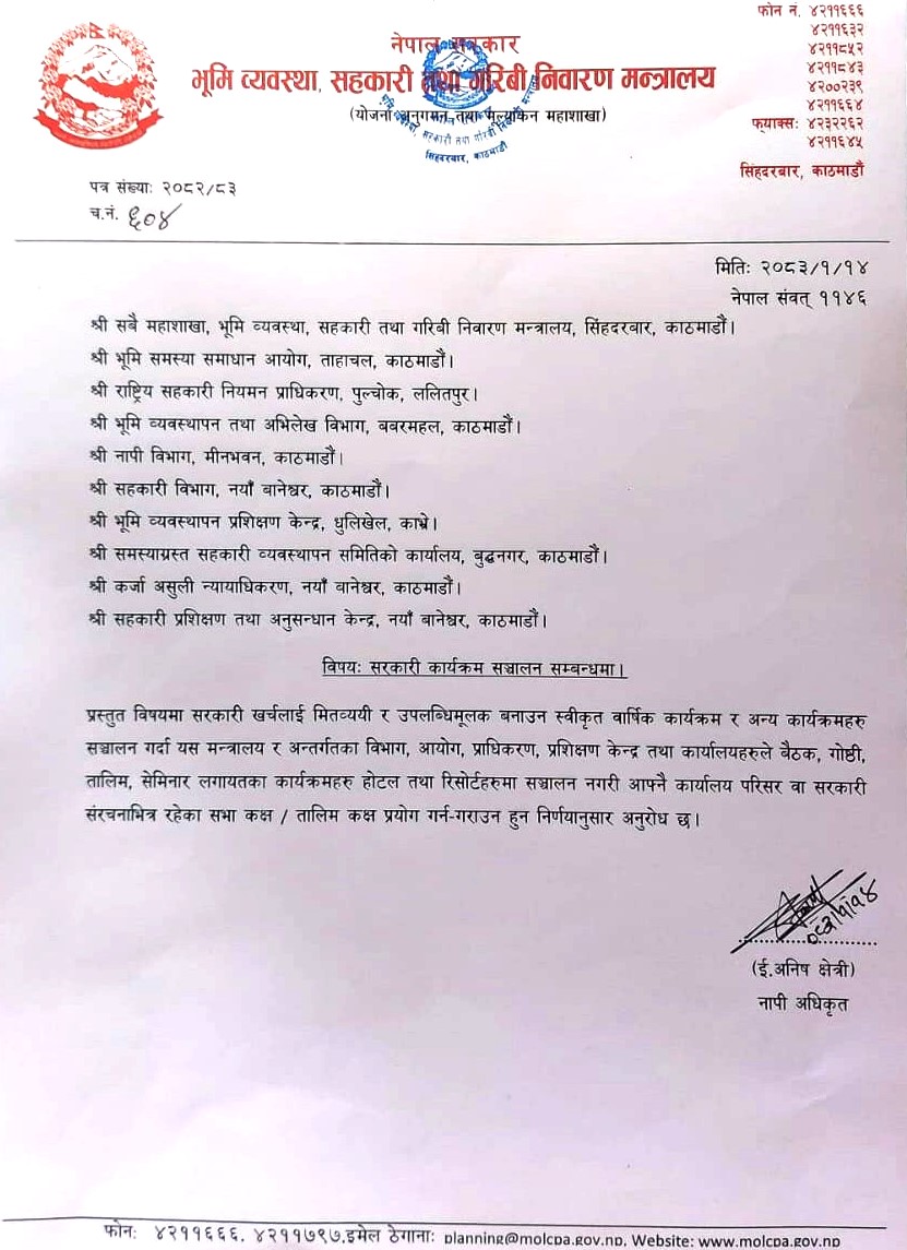 २०८३ बैशाख १४, काठमाडौं । भूमि व्यवस्था, सहकारी तथा गरिबी निवारण मन्त्रालय मातहतका सबै कार्यालयका कार्यक्रमहरू अब कार्यालय भित्रकै सभा हल तथा बैठक कक्षमा मात्रै गर्नुपर्ने भएको छ ।