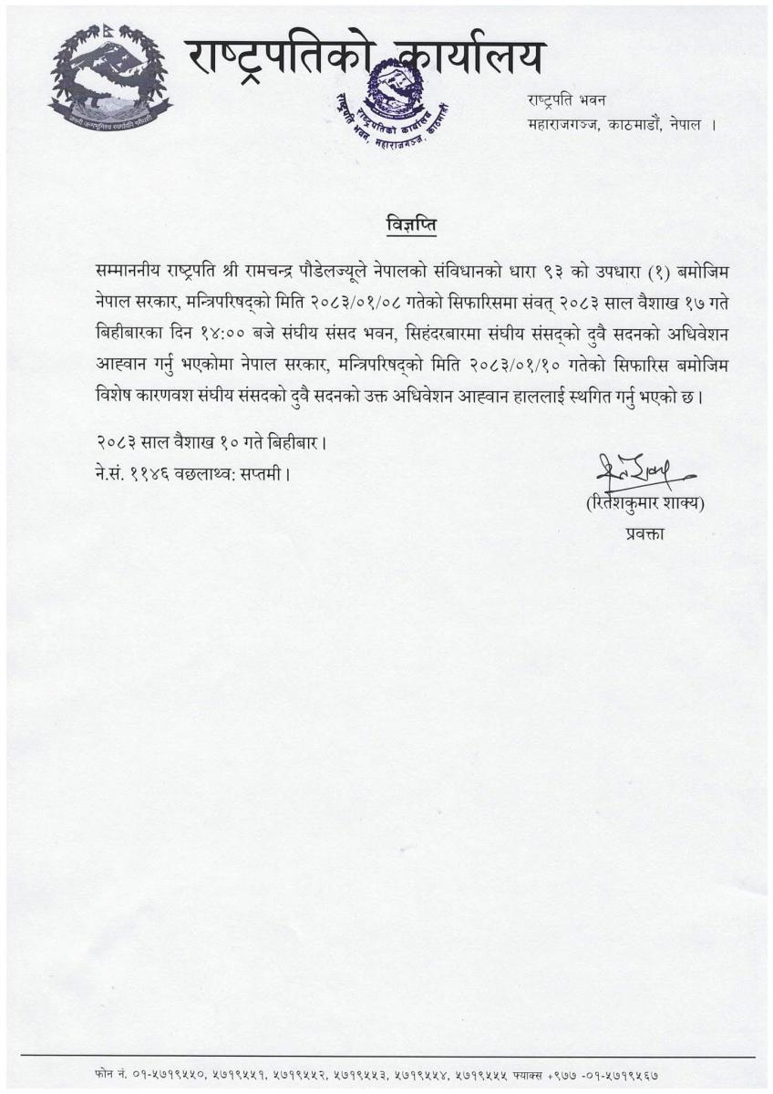 राष्ट्रपति रामचन्द्र पौडेलले नेपालको संविधानको धारा ९३ को उपधारा (१) बमोजिम नेपाल सरकार, मन्त्रिपरिषद्को मिति २०८३/०१/०८ गतेको सिफारिसमा संवत् २०८३ साल वैशाख १७ गते बिहीबारका दिन २ बजे संघीय संसद भवन, सिहंदरबारमा संघीय संसद्को दुवै सदनको अधिवेशन आह्वान गरेकोमा नेपाल सरकार, मन्त्रिपरिषद्को मिति २०८३/०१/१० गतेको सिफारिस बमोजिम विशेष कारणवश संघीय संसदको दुवै सदनको उक्त अधिवेशन आह्वान हाललाई स्थगित गरेको राष्ट्रपतिको कार्यालयले जानकारी दिएको छ ।