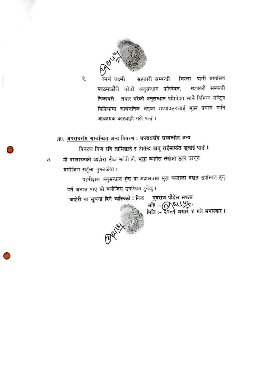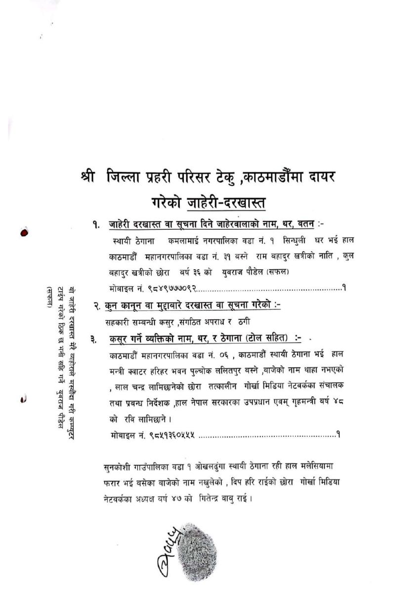 सिन्धुली स्थायी घर भएका युवराज पौडेल (सफल) ले रवि लामिछाने र गितेन्द्रबाबु (जीबी) राईविरुद्ध गत मंगलबार हुलाकमार्फत किटानी जाहेरी पठाएका थिए।