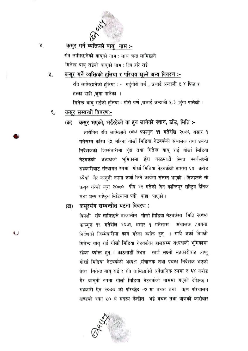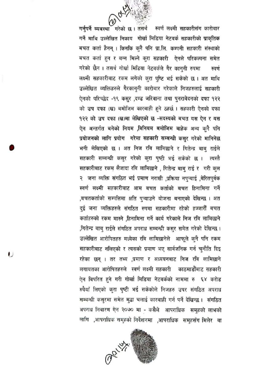 जाहेरीमा लामिछाने २०७७ फागुन ११ देखि २०७९ असार १ गतेसम्म गोर्खा मिडिया नेटवर्कको संचालक तथा प्रबन्ध निर्देशकको जिम्मेवारीमा हुदा स्वर्णलक्ष्मी सहकारीबाट गोर्खा मिडियाको नाममा ६४ करोड गैर कानुनी रुपमा कर्जा लिने कार्यमा संलग्न रहेको उल्लेख छ ।