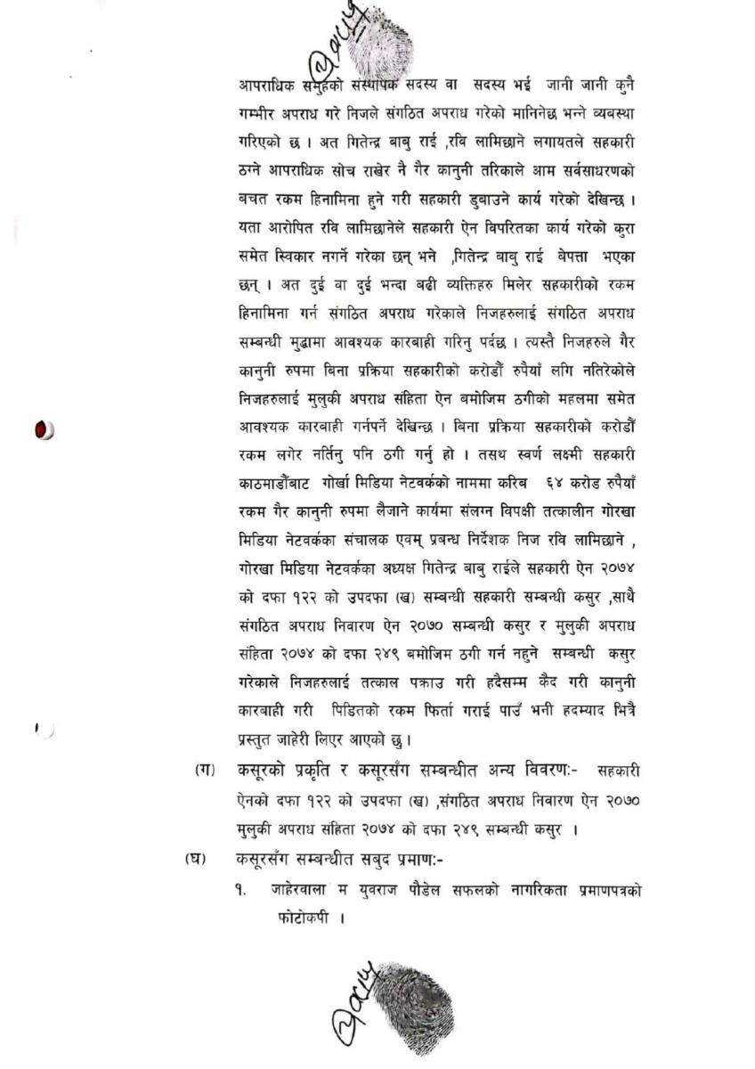 जाहेरीमा सहकारी ठगी अरोपमा फरार रहेका गितेन्द्रबाबु राईलाई पनि प्रतिवादी बनाइएको छ । काठमाडौंस्थित स्वर्णलक्ष्मी सहकारीबाट गोर्खा मिडिया नेटवर्कको नाममा ६४ करोड रुपैयाँ गैरकानुनी रुपमा कर्जा लिई अपचलन गरेको जाहेरीमा उल्लेख छ ।
