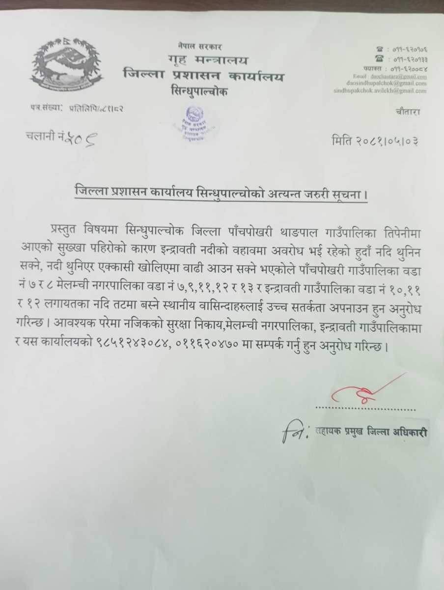 जिल्ला प्रशासन कार्यलय सिन्धुपाल्चोकले एक सूचना प्रकाशित गरि नदी थुनिन सक्ने भएकोले तल्लो तटीय क्षेत्रका नागरिकमा सावधानी अपनाउन र सुरक्षित रहन अनुरोध गरेको छ।