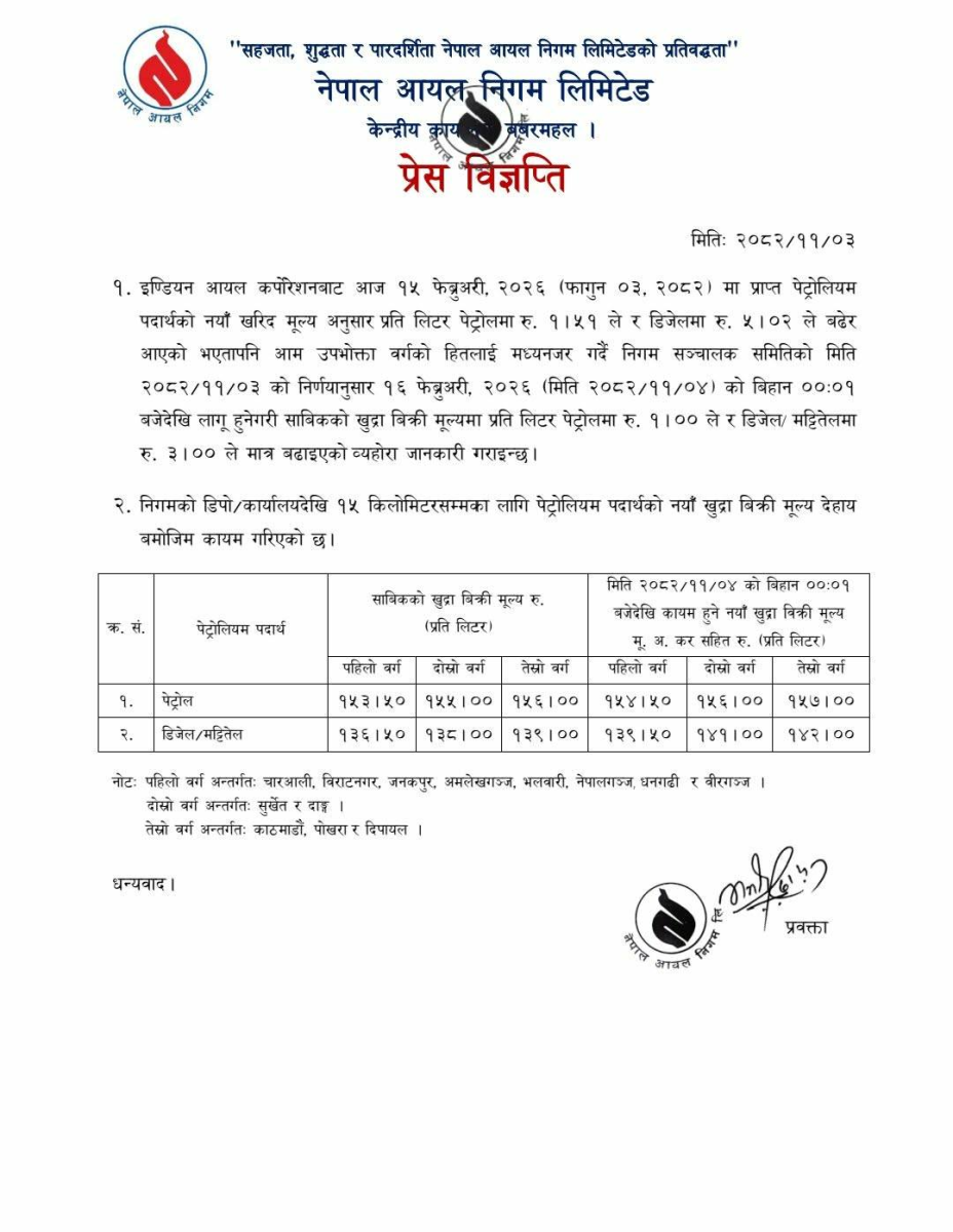 २०८२ फागुन ०३, काठमाडौं । पेट्रोलको मूल्यमा एक रुपैयाँ र डिजेल/मट्टीतेलमा तीन रुपैयाँले वृद्धि भएको नेपाल आयल निगले जनाएको छ ।