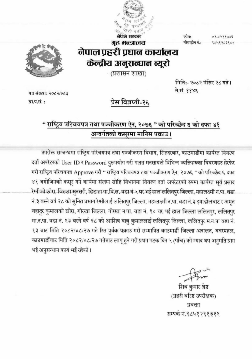 उनीहरूविरुद्ध “राष्ट्रिय परिचयपत्र तथा पञ्जीकरण ऐन, २०७६” को परिच्छेद ६ दफा ४५ अन्तर्गतको कसुरमा काठमाडौँ जिल्ला अदालत, बबरमहलबाट मिति २०८२/०८/२७ गतेदेखि लागू हुने गरी पहिलो पटक पाँच दिनको म्याद थप अनुमति लिई अनुसन्धान कार्य भइरहेको सिआइबीले जनाएको छ ।