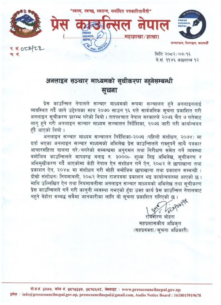 प्रेस काउन्सिलका सहप्रशासकीय अधिकृत तथा सह–प्रवक्ता रामशरण बोहराले हस्ताक्षरित सूचनामा भनिएको छ, ‘माथि उल्लिखित ऐन तथा नियमावलीमा अनलाइन सञ्चारमाध्यमको अभिलेख तथा सूचीकरण प्रेस काउन्सिलले गर्ने गरी कानुनी व्यवस्था नभएको हुँदा उक्त कार्य प्रेस काउन्सिल नेपालबाट नहुने बेहोरा सम्बद्ध सबैमा जानकारीका लागि प्रकाशित गरिएको हो ।’