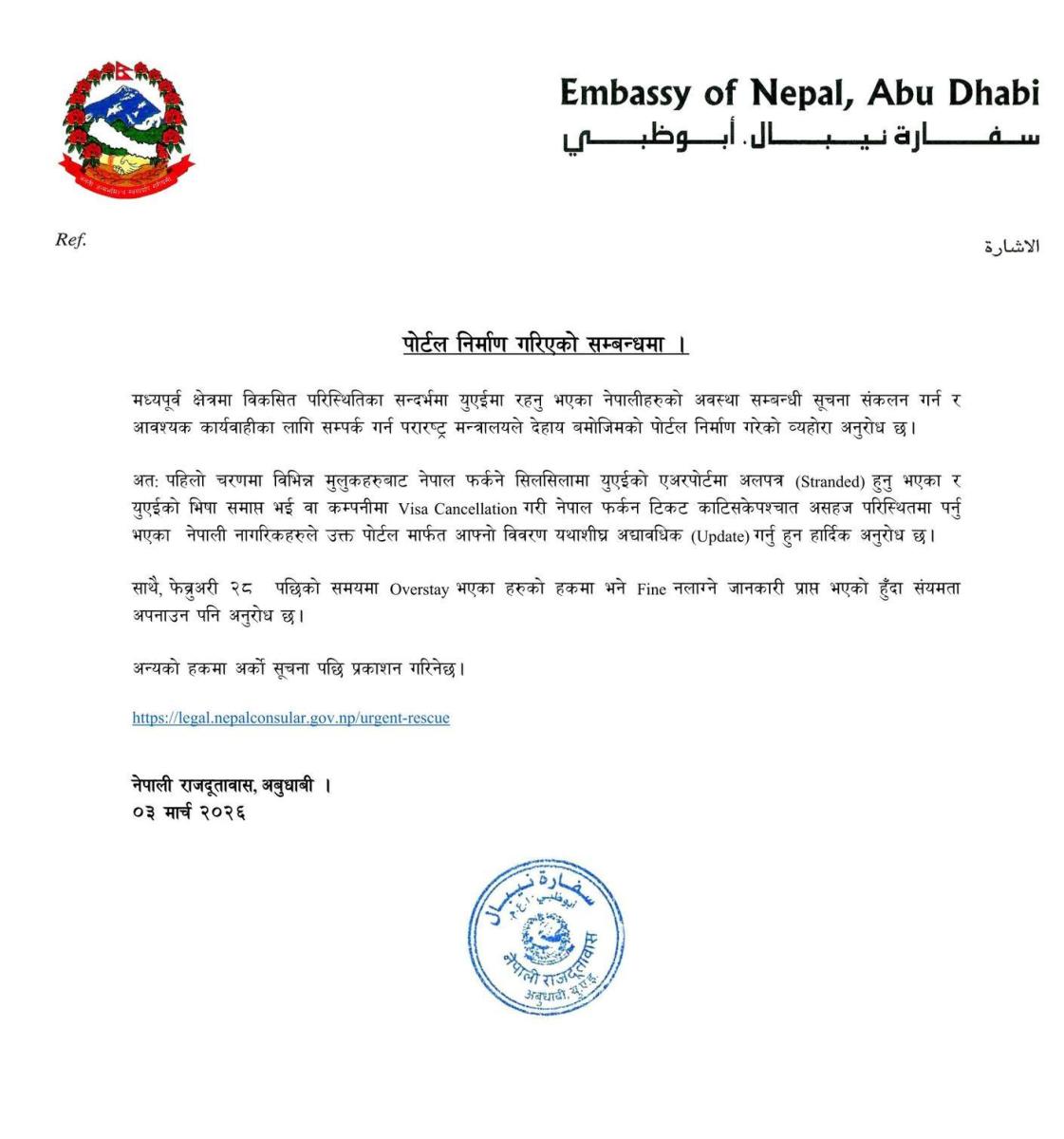 २०८२ फागुन १९, काठमाडौं । मध्यपूर्वी क्षेत्रमा उत्पन्न पछिल्लो तनावका कारण अलपत्र अवस्थामा परेका नेपाली नागरिकको विवरण संकलन र आवश्यक सहयोग तथा उद्धारका लागि परराष्ट्र मन्त्रालय कन्सुलर सेवा विभागले अनलाइन पोर्टल सञ्चालनमा ल्याएको छ ।