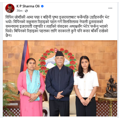 ‘विपिन जोशीकी आमा पद्मा र बहिनी पुष्पा इजरायलबाट फर्केपछि उहाँहरुसँग भेट भयो । विपिनको सकुशल रिहाइको पहल गर्ने सिलसिलामा नेपाली दूतावासको समन्वयमा इजरायली राष्ट्रपति र त्यहाँको संसदका अध्यक्षसँग भेटेर फर्कनु भएको थियो । विपिनको रिहाइका पहलका लागि सरकारले कुनै पनि कसर बाँकी राखेको छैन,’ प्रधानमन्त्रीले लेखेका छन् ।