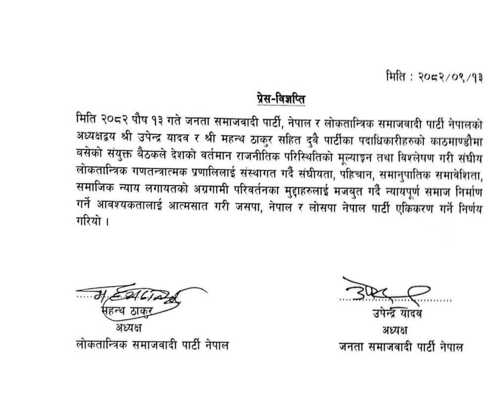 जसपा नेपाल अध्यक्ष उपेन्द्र यादव र लोसपाका अध्यक्ष महन्थ ठाकुरले संघीयता, पहिचान, समानुपातिक समावेशिता, समाजिक न्याय लगायतको अग्रगामी परिवर्तनका मुद्दाहरुलाई मजबुत गर्दै पार्टी एकीकरण गरेको विज्ञप्ति जारी गरेका छन् ।