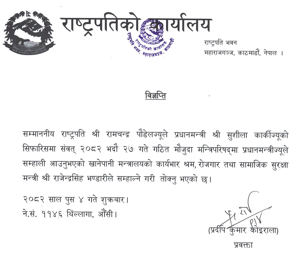 २०८२ पुष ०४, काठमाडौं । राष्ट्रपति रामचन्द्र पौडेलले खानेपानी मन्त्रालयको जिम्मेवारी श्रम, रोजगार तथा सामाजिक सुरक्षामन्त्री राजेन्द्रसिंह भण्डारीले सम्हाल्ने गरी तोकेका छन् ।