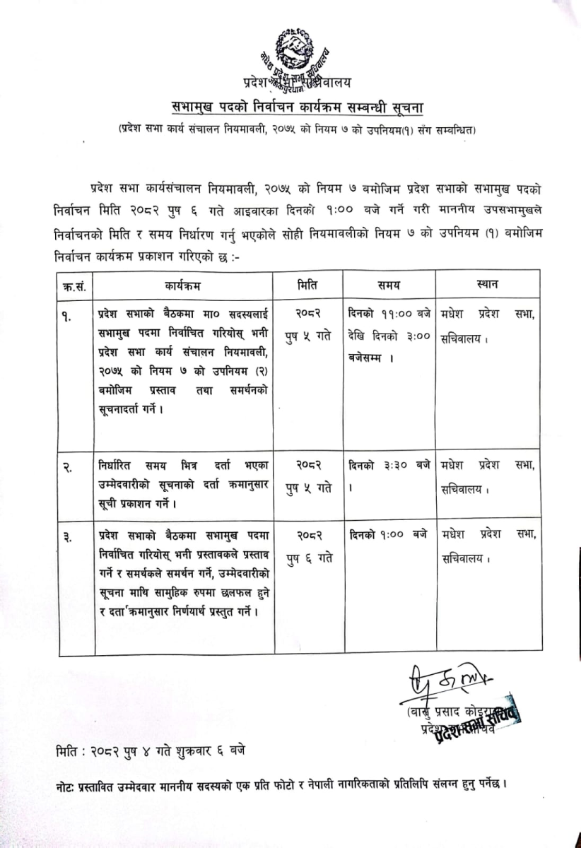 २०८२ पुष ०४, काठमाडौं । मधेशमा रिक्त सभामुखको निर्वाचनको लागि मधेश प्रदेश सभा सचिवालयले निर्वाचन तालिका प्रकाशन गरेको छ । मंसिर ६ गते हुने सभामुख निर्वाचनका लागि शनिबार बिहान ११ बजेदेखि दिउँसो ३ बजेसम्म प्रदेश सभा सचिवालयमा प्रस्तावक र समर्थकसहित सूचना दर्ता गराउन सकिने तालिकामा उल्लेख छ ।