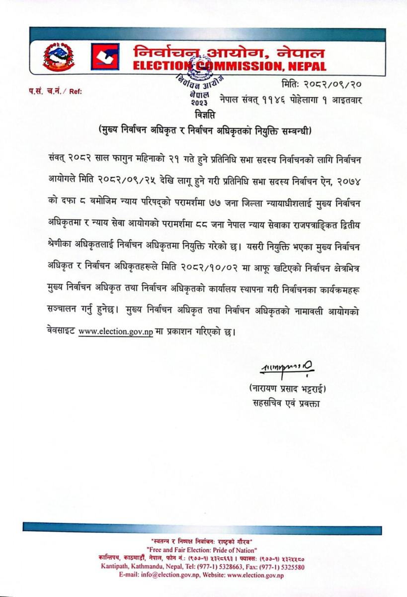 आगामी पुस २५ गतेदेखि लागू हुने गरी प्रतिनिधि सभा सदस्य निर्वाचन ऐन, २०७४ बमोजिम ७७ जिल्ला न्यायाधीशलाई मुख्य निर्वाचन अधिकृत र ८८ जना न्याय सेवाका राजपत्रांकित द्वितीय श्रेणीका अधिकृतहरुलाई निर्वाचन अधिकृत तोकेको हो ।