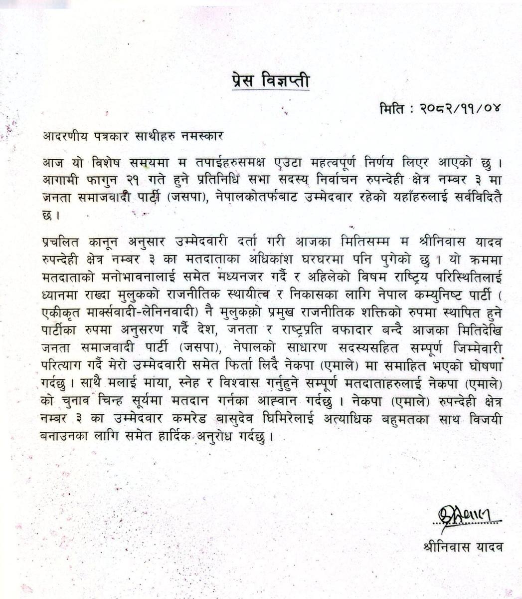 २०८२ फागुन ०४, काठमाडौं । प्रतिनिधिसभा सदस्य निर्वाचन अन्तर्गत रुपन्देही-३ मा जनता समाजवादी पार्टी (जसपा), नेपालका तर्फबाट उम्मेदवार रहेका श्रीनिवास यादवले उम्मेदवारी फिर्ता लिएका छन् ।
