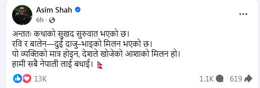 वार्तापछि मंगलवार सामाजिक सञ्जालमार्फत प्रतिक्रिया दिँदै शाहले वार्तालाई ‘कथाको सुखद सुरुवात’ को भएको बताएका छन् । ‘अन्ततः कथाको सुखद सुरुवात भएको छ । रवि र बालेन-दुई दाजु-भाइको मिलन भएको छ । यो व्यक्तिको मात्र होइन, देशले खोजेको आशाको मिलन हो । हामी सबै नेपालीलाई बधाई ।’ उनले लेखेका छन् ।