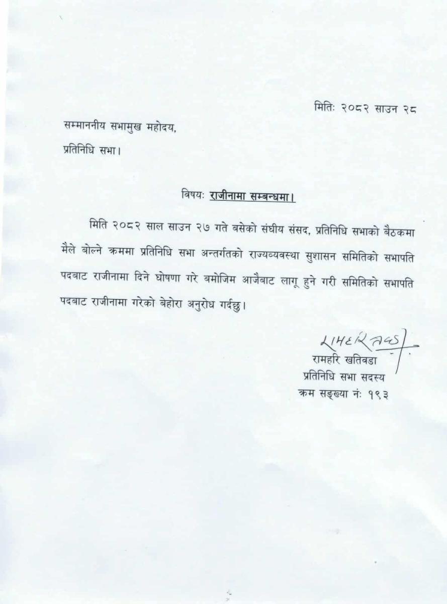 मिति २०८२ साल साउन २७ गते बसेको संघीय संसद, प्रतिनिधिसभाको बैठकमा मैले बोल्ने क्रममा प्रतिनिधिसभा अन्तर्गतको राज्यव्यवस्था सुशासन समितिको सभापति पदबाट राजीनामा दिने घोषणा गरे बमोजिम आजैबाट लागु हुने गरी समितिको सभापति पदबाट राजीनामा गरेको बेहोरा अनुरोध गर्दछु,’ खतिवडाले पत्रमा लेखेका छन् ।