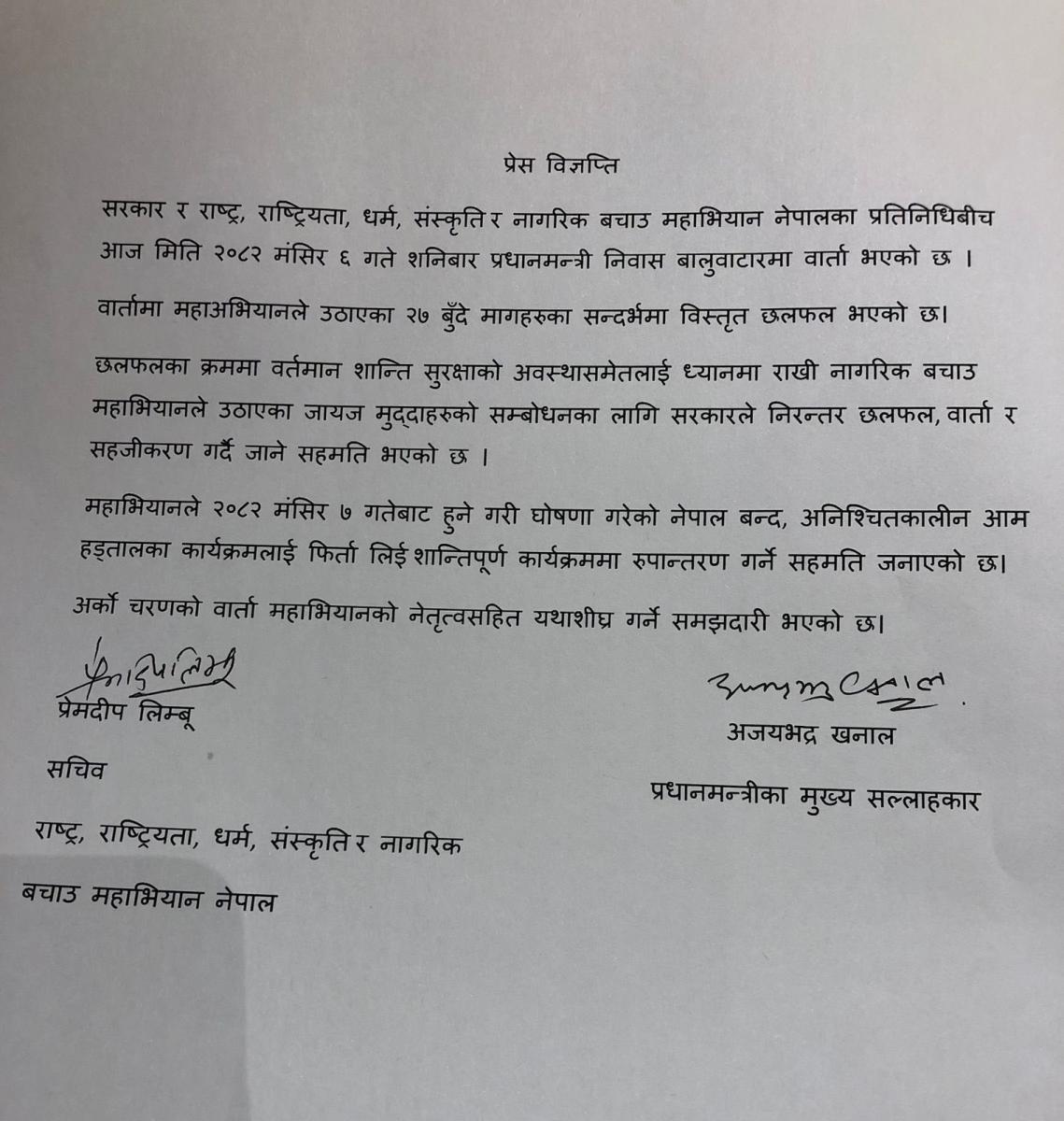 वार्तामा महाअभियानले उठाएका २७ बुँदे मागहरूका सन्दर्भमा विस्तृत छलफल भई २०८२ मङ्सिर ७ गतेबाट हुने गरी घोषणा गरेको नेपाल बन्द, अनिश्चितकालीन आम हड्तालका कार्यक्रमलाई फिर्ता लिन सहमति छ ।