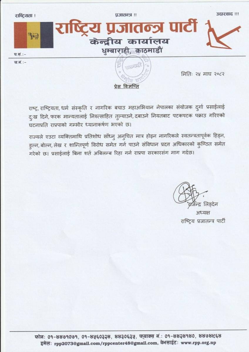 विज्ञप्तिमा भनिएको छ,‘राज्यले एउटा व्यक्तिमाथि प्रतिशोध साँध्नु अनुचित मात्र होईन नागरिकले स्वतन्त्रतापूर्वक हिँड्न, डुल्न, बोल्न, लेख्न र शान्तिपूर्ण विरोधसमेत गर्न पाउने संविधानप्रदत्त अधिकारको कुण्ठित समेत गरेको छ ।प्रसाईंलाई बिनाशर्त अविलम्ब रिहा गर्न राप्रपा सरकारसँग माग गर्दछ।’