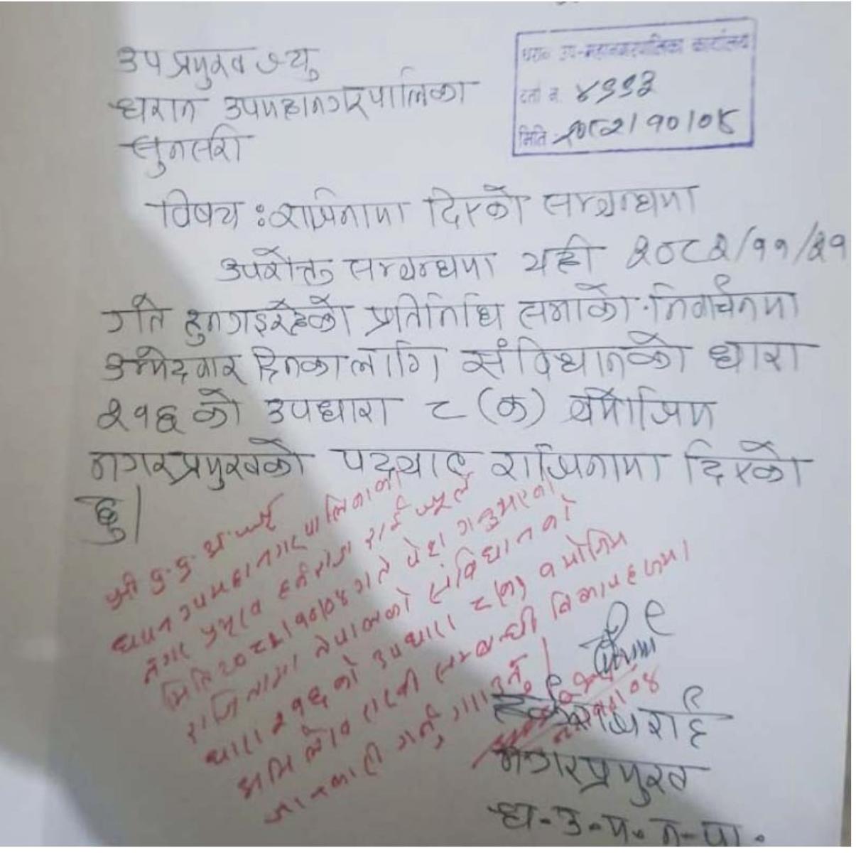 आइतबार नै पालिकाको बैठकमा धरान–१७ का वडाध्यक्ष सूर्यबहादुर भट्टराईले पनि राजीनामा दिएका छन् । उनलाई नेकपाले सुनसरी क्षेत्र नम्बर १ बाट प्रतिनिधि सभाको उम्मेदवार बनाएको छ ।
