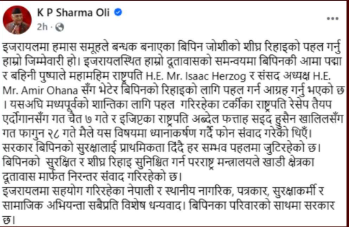 ‘इजरायलमा हमास समूहले बन्धक बनाएका बिपिन जोशीको शीघ्र रिहाइको पहल गर्नु हाम्रो जिम्मेवारी हो । इजरायलस्थित हाम्रो दूतावासको समन्वयमा बिपिनकी आमा पद्मा र बहिनी पुष्पाले महामहिम राष्ट्रपति H.E. Mr. Isaac Herzog संसद अध्यक्ष H.E. Mr. Amir Ohana इजबलब सँग भेटेर बिपिनको रिहाइको लागि पहल गर्न आग्रह गर्नु भएको छ । यसअघि मध्यपूर्वको शान्तिका लागि पहल गरिरहेका टर्कीका राष्ट्रपति रेसेप तैयप एर्दोगानसँग गत चैत ७ गते र इजिप्टका राष्ट्रपति अब्देल फत्ताह सइद हुसैन खालिलसँग गत फागुन २८ गते मैले यस विषयमा ध्यानाकर्षण गर्दै फोन संवाद गरेको थिएँ। सरकार बिपिनको सुरक्षालाई प्राथमिकता दिंदै हर सम्भव पहलमा जुटिरहेको छ ।’ उनले सामाजिक सञ्जालमा लेखेमा छन् ।