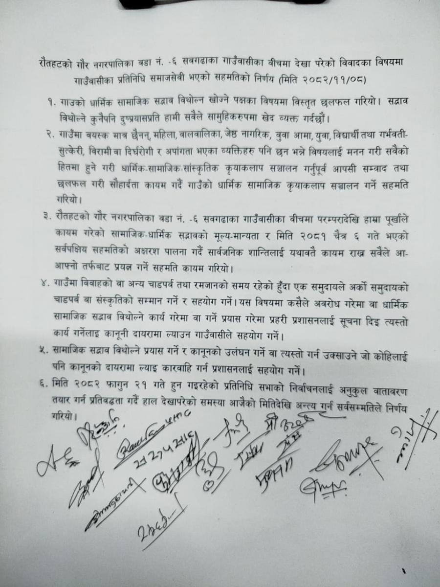 २०८२ फागुन ०९, रौतहट । रौतहटको गौर नगरपालिका वडा नं. ६ सवगढामा केही समयदेखि देखा परेको विवाद समाधान गर्दै गाउँमा धार्मिक तथा सामाजिक सद्भाव कायम राख्न स्थानीय प्रतिनिधि र समाजसेवीहरूबीच ६ बुँदे सहमति भएको छ । फागुन ८ गते (हिजो) बसेको सर्वपक्षीय बैठकले गाउँको शान्ति सुरक्षा र आपसी भाइचारालाई मजबुत बनाउने निर्णय गरेको हो ।