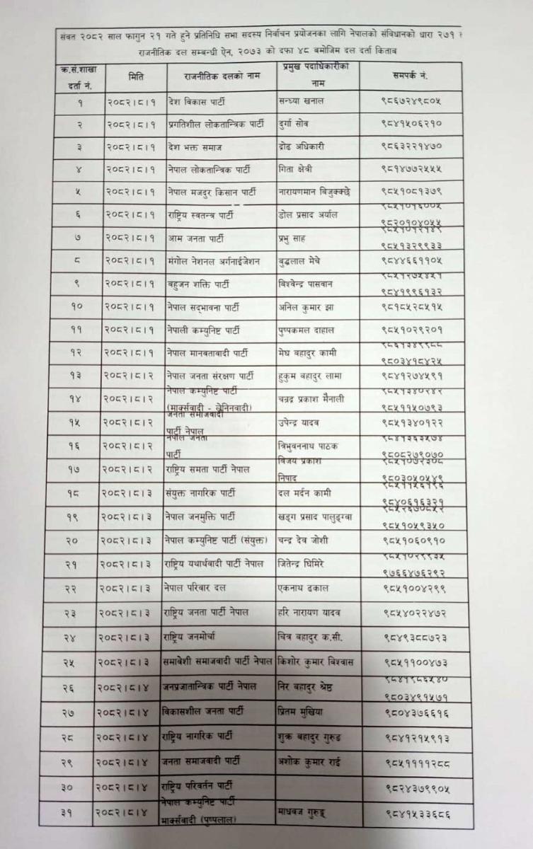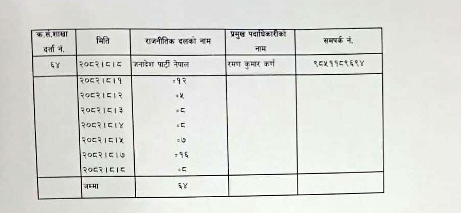 २०८२ मंसिर ८, काठमाडौँ । निर्वाचनमा आयोगमा ६४ दल दर्ता भएका छन् । प्रतिनिधिसभा निर्वाचनका लागि दल दर्ता भएको आयोगले जनाएको छ ।