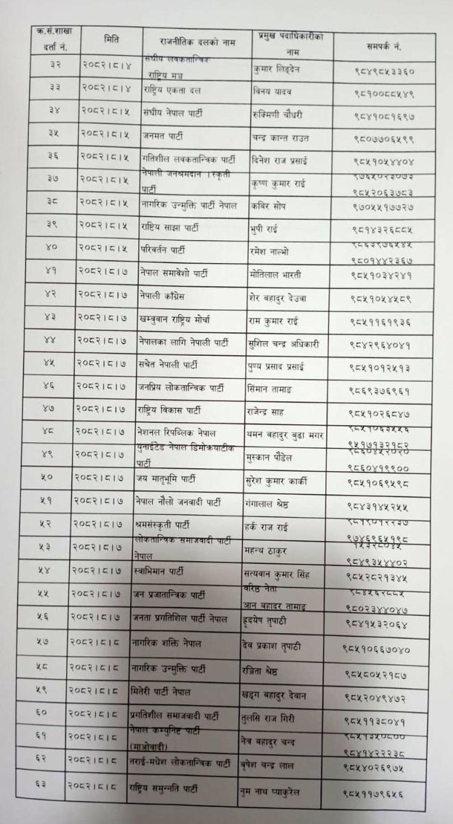 निर्वाचन आयोगका प्रवक्ता नारायणप्रसाद भट्टराईले आयोगमा दर्ता भएकामध्ये ६१ दलले प्रतिनिधिसभा निर्वाचन प्रयोजनका लागि दल दर्ता गरेको जानकारी दिए । हालसम्म आयोगमा दर्ता कायम भएका दलको संख्या भने १३२ रहेको छ ।