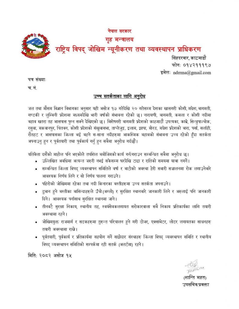 विभागले विशेषगरि वागमती प्रदेशका काठमाडौँ उपत्यका, काभ्रे, सिन्धुपाल्चोक, रसुवा, मकवानपुर, चितवन, कोशी प्रदेशका संखुवासभा, ताप्लेजुङ, इलाम, झापा, मोरङ मधेश, प्रदेशका बारा, पर्सा, सर्लाही, रौतहट र आसपासका जिल्ला भई बहने स–साना नदीहरुमा आकस्मिक बहावको सम्भावना उच्च रहेको हुँदा मुख्यतः असोज १८–२० सम्म विशेष सतर्कता अपनाउन आज अनुरोध गरेको हो ।