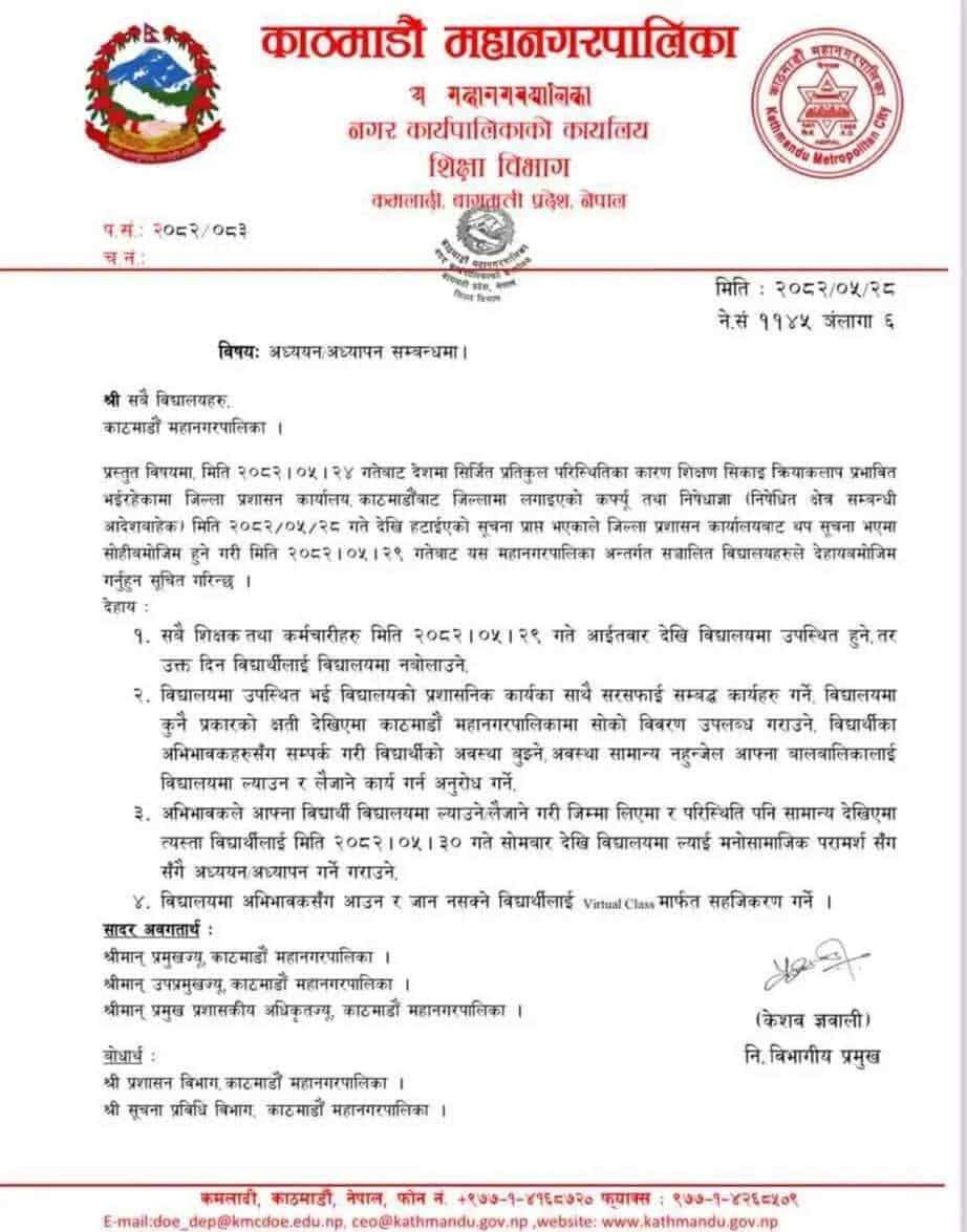 काठमाडौं महानगरले मातहतका विद्यालयहरूलाई पठाएको सूचनामा भोलि शिक्षक कर्मचारीहरूलाई विद्यालयमा उपस्थित हुन तर विद्यार्थीलाई नबोलाउन भनिएको छ । शिक्षक कर्मचारीले विद्यालयको प्रशासनिक कार्यका साथै सरसफाइ सम्बद्ध कार्यहरू गर्न तथा कुनै प्रकारको क्षति देखिएमा महानगरमा विवरण उपलब्ध गराउन समेत निर्देशन दिइएको छ ।