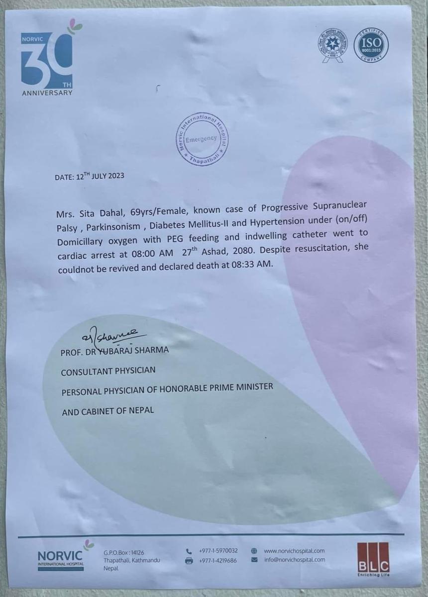 तर, उनको उपचारको क्रममा काठमाडौंको थापाथलीस्थित नर्भिक अस्पतालमो ८ बजेर ३३ मिनेट निधन भएको अस्पतालले जनाएको छ ।सीता पार्किन्सन जस्तो देखिने एक जटिल प्रकारको रोगले पीडित थिइन् ।