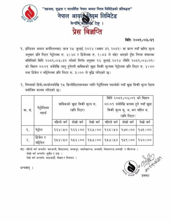 काठमाडौं, असार ३१ । नेपाल आयल निगमले पेट्रोल, डिजेल र मट्टितेलको मूल्य बढाएको छ । सोमबार बसेको आयल निगम सञ्चालक समितिको बैठकले पेट्रोलमा प्रतिलिटर ४ रुपैयाँ र डिजेल तथा मट्टितेलमा प्रतिलिटर ३ रुपैयाँ बढाउने निर्णय गरेको हो । निगमका अनुसार बढेको मूल्य सोमबार राति १२ बजेदेखि कार्यान्वयन हुनेछ ।