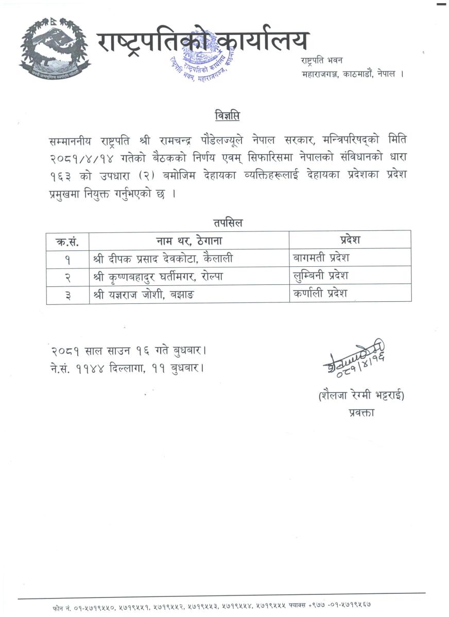 राष्ट्रपति पौडेलले सरकारको सिफारिसमा बागमती प्रदेश प्रमुखमा कैलालीका दीपक प्रसाद देवकोटा, लुम्बिनी प्रदेश प्रमुखमा रोल्पा घर भएका कृष्णबहादुर घर्तीमगर र कर्णाली प्रदेश प्रमुखमा बझाङ घर भएका यज्ञराज जोशीलाई नियुक्त गरेका हुन् ।