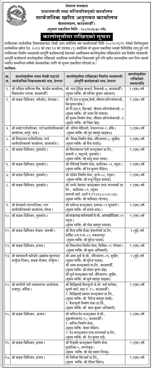 कार्यालयले आज एक सूचना जारी गर्दै असोज २९ गतेको निर्णय अनुसार सूचना प्रकाशित भएको मितिदेखि लागू हुने गरी कालोसूचीमा राखिएका निर्माण कम्पनीको सूची सार्वजनिक गरेको हो ।