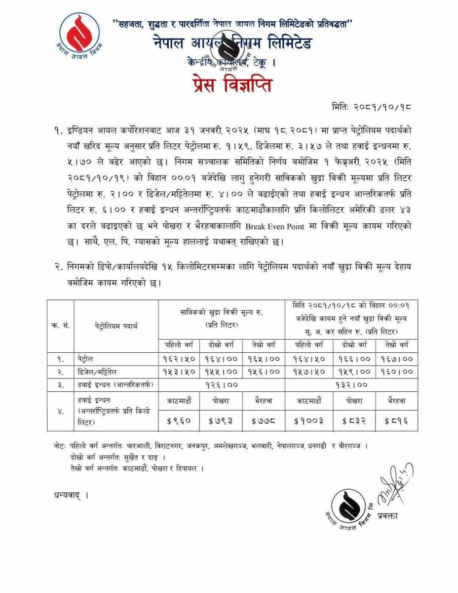 निगमले इण्डियन आयल कर्पोरेशनबाट पेट्रोल, डिजेल र मट्टितेलको मूल्य बढेर आएकाले मूल्य समायोजन गरिएको जनाएको छ । निगमका अनुसार पेट्रोलमा प्रतिलिटर २ रुपैयाँ तथा डिजेल र मट्टितेलमा ४ रुपैयाँले मूल्य बढाइएको छ । यस्तै हवाई इन्धनमा आन्तरिकतर्फ प्रतिलिटर ६ र अन्तर्राष्ट्रियतर्फ काठमाडौंका लागि प्रतिलिटर ४३ डलरका दरले बढाइएको छ भने पोखरा र भैरहवाका लागि ब्रेक इभन पोइन्टमा बिक्री मूल्य कायम गरिएको निगमले जनाएको छ ।