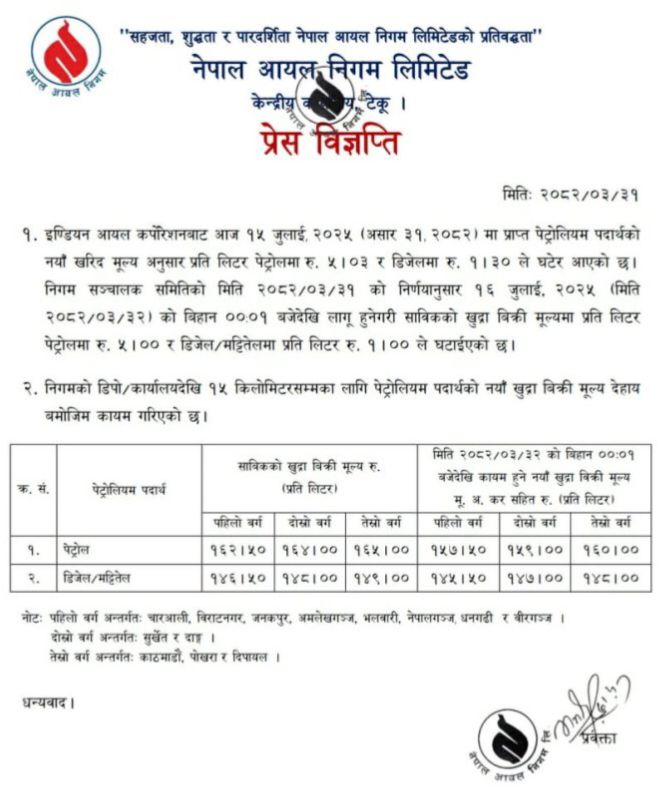 निगम सञ्चालक समितिको निर्णयानुसार आज राति १२ बजेदेखि लागु हुनेगरी साविकको खुद्रा बिक्री मूल्यमा प्रति लिटर पेट्रोलमा ५ रुपैयाँ र डिजेल / मट्टितेलमा प्रति लिटर १ रुपैयाँले मूल्य घटाएको हो ।