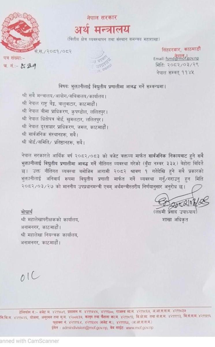 अर्थ मन्त्रालयले साउन १ गतेदेखि सार्वजनिक निकायबाट हुने सबै प्रकारका भुक्तानीलाई अनिवार्य रुपमा विद्युतीय प्रणालीमार्फत गर्ने व्यवस्था मिलाउन सबै मन्त्रालय, नेपाल राष्ट्र बैंक, सार्वजनिक संस्थान, बोर्ड, समिति तथा प्रतिष्ठानहरुलाई परिपत्र गरेको छ ।