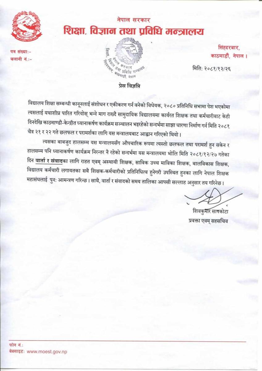 मन्त्रालयका प्रवक्ता एवं सहसचिव शिवकुमार सापकोटाले आज विज्ञप्ति जारी गर्दै आन्दोलनरत सबै शिक्षक कर्मचारीको प्रतिनिधित्व हुने गरी महासंघलाई वार्ता र संवादका लागि आह्वान गरेका हुन् । वार्ताको समय भने आपसी सल्लाहअनुसार तय गरिने विज्ञप्तिमा उल्लेख छ ।