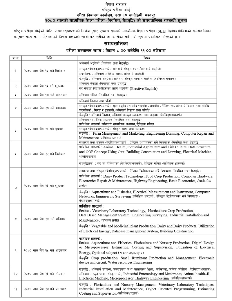 राष्ट्रिय परीक्षा बोर्डअन्तर्गत परीक्षा नियन्त्रण कार्यालयको बैठकले एसईईको तालिका समेत सार्वजनिक गरेको हो । परीक्षाका लागि चार लाख ८९ हजारभन्दा धेरै विद्यार्थीले फारम भरेका छन् ।
