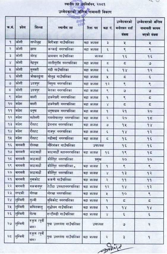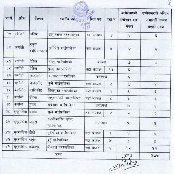 आयोगले जिल्ला समन्वय समिति, नगरपालिका र गाउँपालिकाको प्रमुख, उपप्रमुख तथा अध्यक्ष, उपाध्यक्ष र वडा अध्यक्षका लागि उम्मेदवारी दिएका ४१० जनामध्ये ३ जना निर्विरोध निर्वाचित भएको र ३१ जनाले उम्मेदवारी फिर्ता लिएपछि ३७६ जना उम्मेदवारको अन्तिम नामावली प्रकाशन गरेको हो ।
