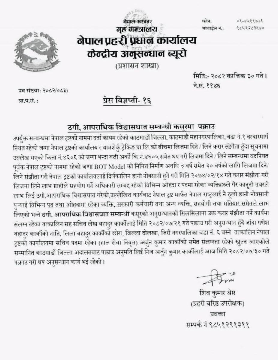 शेर्पा समूहसम्बद्ध थामशेर्कु ट्रेकिङलाई नेपाल ट्रष्ट स्वामीत्वको दरबारमार्गस्थित जमिन लिजमा दिएको प्रकरणमा यसअघि तत्कालीन सहसचिव लेखबहादुर कार्की पक्राउ परेका थिए।
