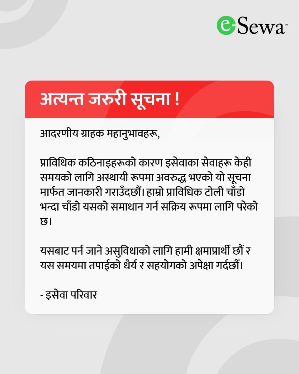 प्राविधिक कठिनाइहरूको कारण इसेवाका सेवाहरू केही समयको लागि अस्थायी रूपमा अवरुद्ध भएको सूचना मार्फत जनाएको छ ।