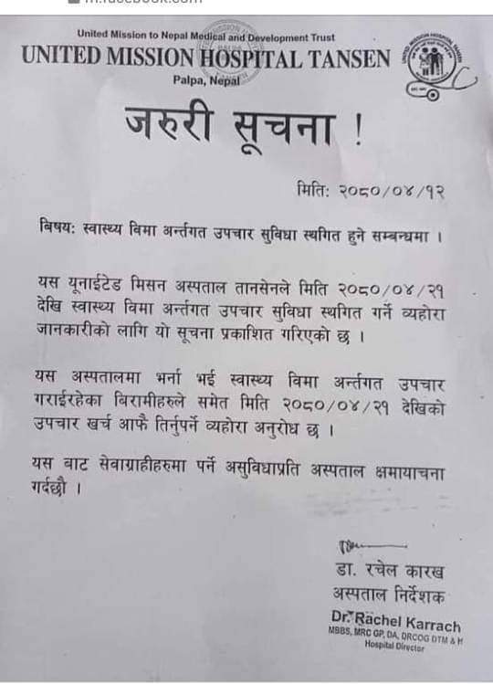 अस्पतालले साउन २१ गतेदेखि स्वास्थ्य वीमा गरेवापत बिरामीले पाउने उपचार तथा अन्य सुबिधा नदिने निर्णय गरेको जनाएको छ । अस्पतालले शुक्रबार पत्रकार सम्मेलनमार्फत वीमा सेवा सञ्चालन गर्ने चाहना हुँदाहुँदै पनि स्थगित गर्न बाध्य भएको जनाएको छ ।अस्पतालमा आउने बिरामीलाई वीमा सेवा अन्तर्गतको उपचार सुबिधा दिने चाहना हुँदाहुँदै पनि अस्पताल बचाउने उद्देश्यले सेवालाई निरन्तरता दिन नसकेकाे अस्पतालकी निर्देशक डा. रचेल कारखले बताउनुभयो । हामीले दुःखी भएर यो भन्न बाध्य छौँ कि, वीमा बोर्डले समयमै भुक्तानी नदिने, भुक्तानी दिएपनि दावी रकममा ३० प्रतिशत कटौती गर्ने र बजार मुल्य अनुसारको मुल्य नपाउँदा सेवा बन्द गर्न बाध्य छौँ निर्देशक कारखले भन्नुभयो ।