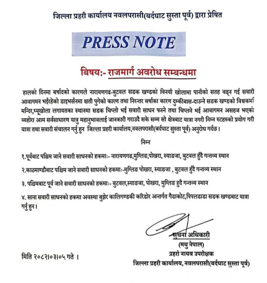५ असार २०८२, काठमाडौँ । लगातारको वर्षाका कारण आएको बाढी र पहिरोले पूर्व-पश्चिम राजमार्गको नारायणगढ-बुटवल सडक खण्ड अवरुद्ध भएको छ । जिल्ला प्रहरी कार्यालय, नवलपरासी (बर्दघाट सुस्ता पूर्व) ले बिहीबार सूचना जारी गर्दै यात्रुहरूलाई वैकल्पिक मार्ग प्रयोग गर्न आग्रह गरेको छ ।
