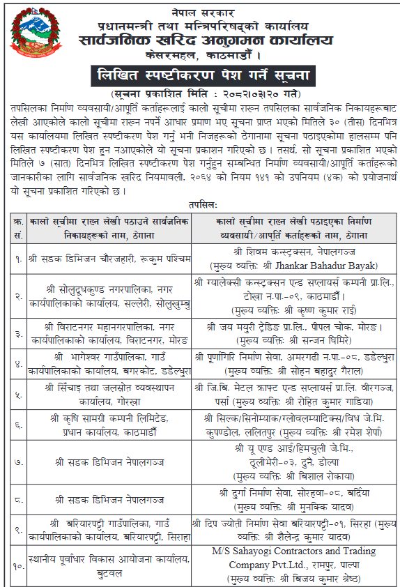 २० असार २०८२, काठमाडौं । सार्वजनिकखरिद अनुगमन कार्यालयले विभिन्न १० निर्माण व्यवसायी र आपूर्तिकर्तालाई सात दिने लिखित स्पष्टीकरण सोधेको छ । कार्यालयले आज एक सूचना जारी गरी कालोसूचीमा राख्ननपर्नेको कारणसहित सात दिन भित्र लिखित स्पष्टीकरण पेश गर्न भनेको हो ।