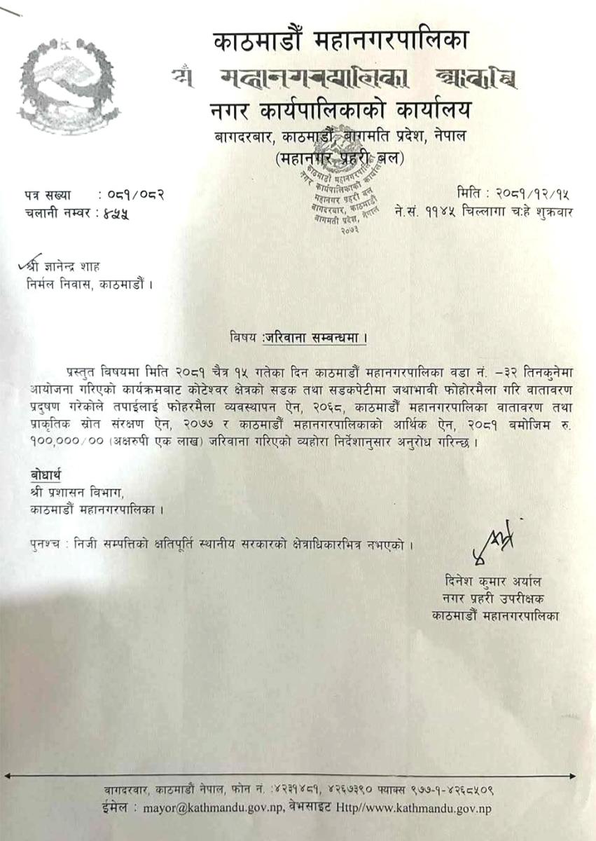 १६ चैत्र २०८१, काठमाडौं । काठमाडौं महानगरपालिकाले पूर्वराजा ज्ञानेन्द्र शाहलाई ७ लाख ९३ हजार रुपैयाँ जरिवाना तोकेको छ ।महानगरले हिजो (शुक्रबार) तीनकुनेमा भएको प्रदर्शनलाई लिएर विभिन्न ९ वटा शीर्षकमा ८ वटा पत्र लेखेर सो रकमको जरिवानासहितको पत्र काटेको हो ।