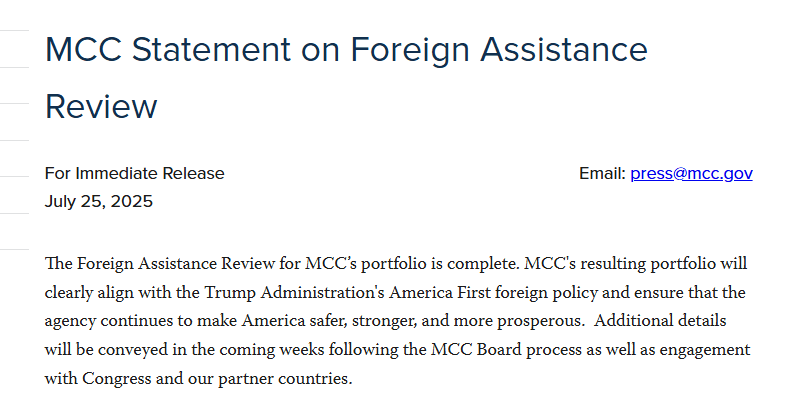 ११ साउन २०८२, काठमाडौं । नेपालमा कार्यान्वयनमा रहेको ‘मिलेनियम च्यालेन्ज कर्पोरेसन’ (एमसीसी) को कम्प्याक्टलाई निरन्तरता दिने निर्णय अमेरिकी सरकारले गरेको छ ।